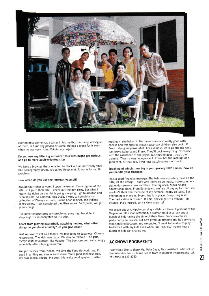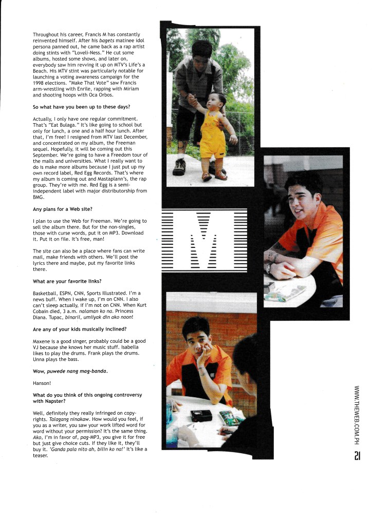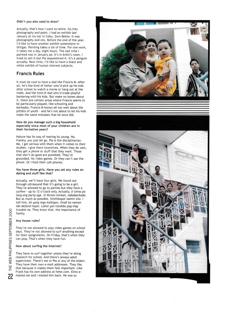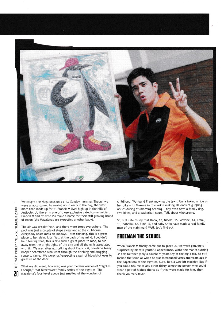 Francis Magalona was my adolescent crush. I had his poster pinned on my closet, and so this interview was special for me. It was a joy seeing him get his act together, making music and having a family. In the interview, he talks about giving up drinking because he wants to be able to play basketball with his kids in his 50s. Sigh!