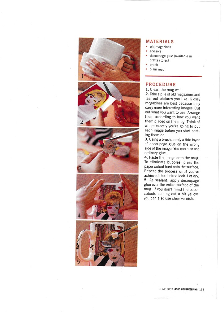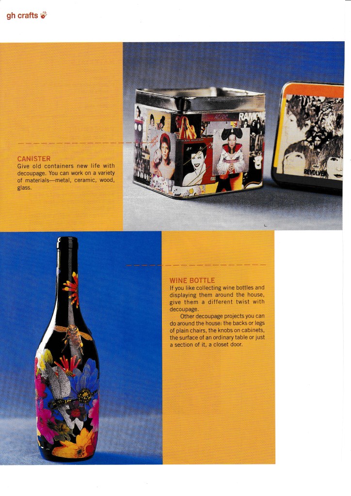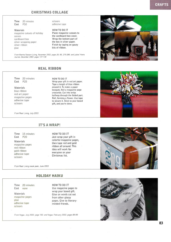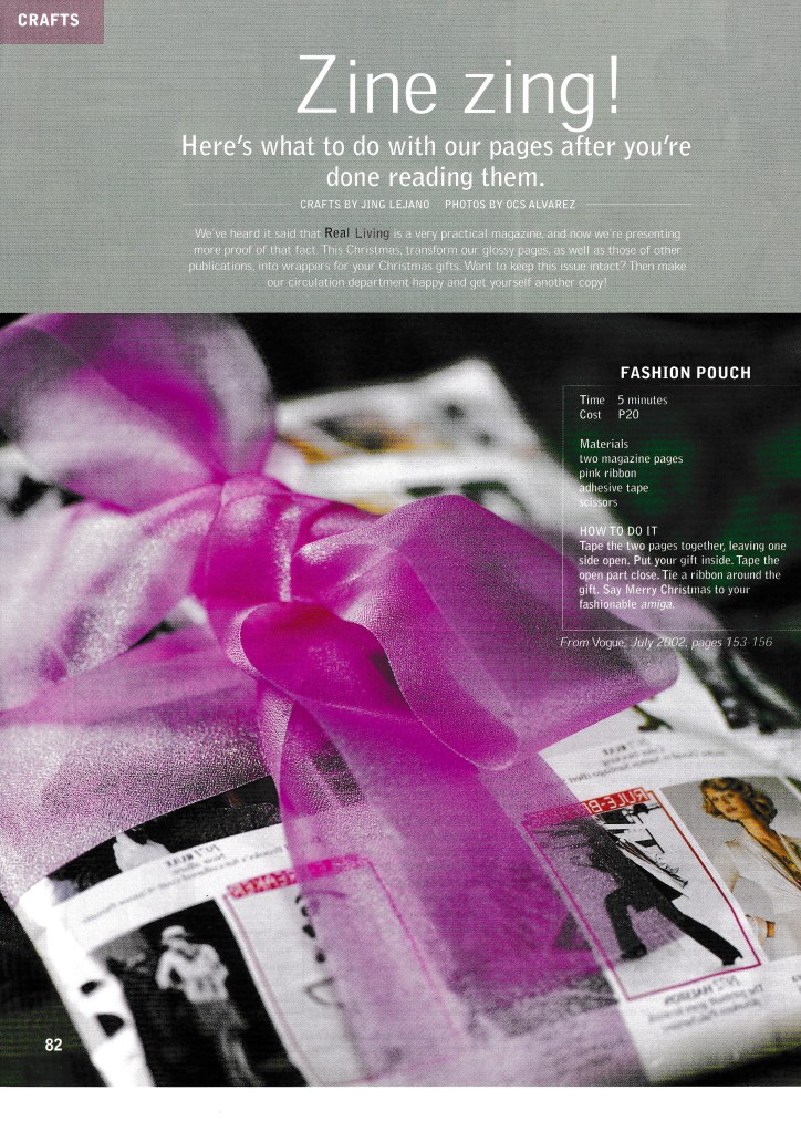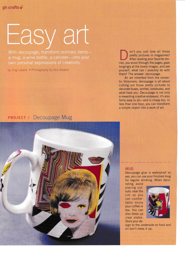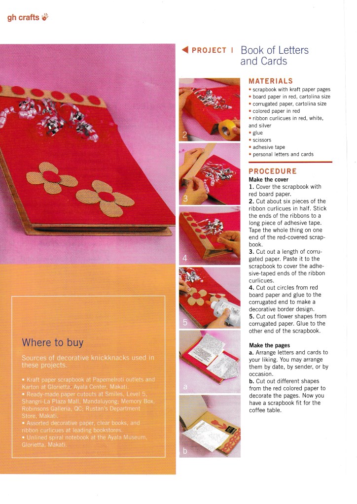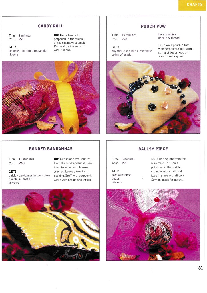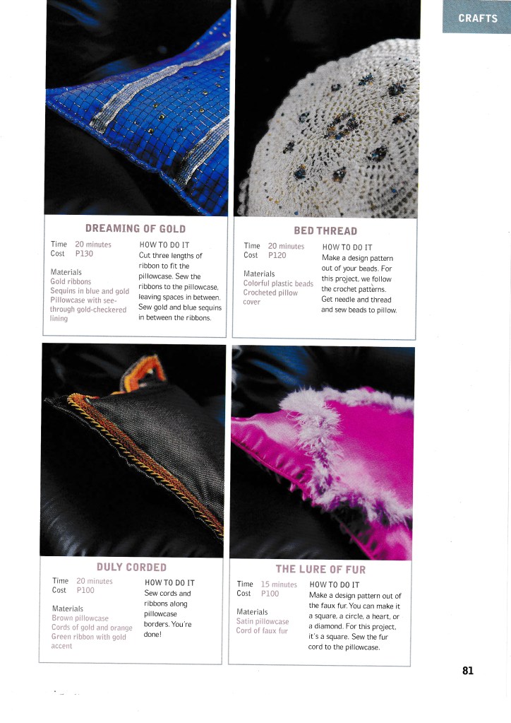 I love making things with my hands and once upon a time, I was asked to do crafts stories for Good Housekeeping PH and Real Living. I loved it! I like working with sequins, ribbons, and colored paper. At the time, I was particularly interested in decoupage, and decoupage-d all sorts of things, including our dining table and my dressing table. It was wonderful!