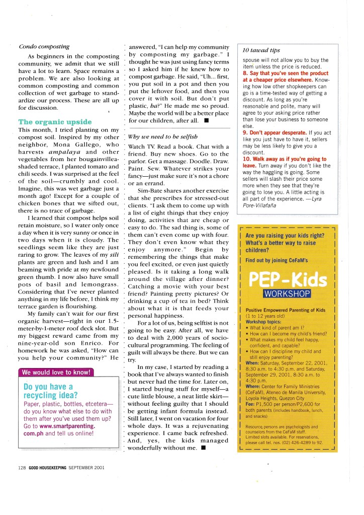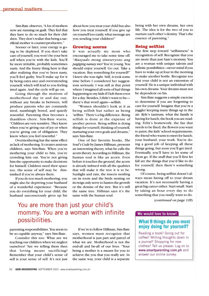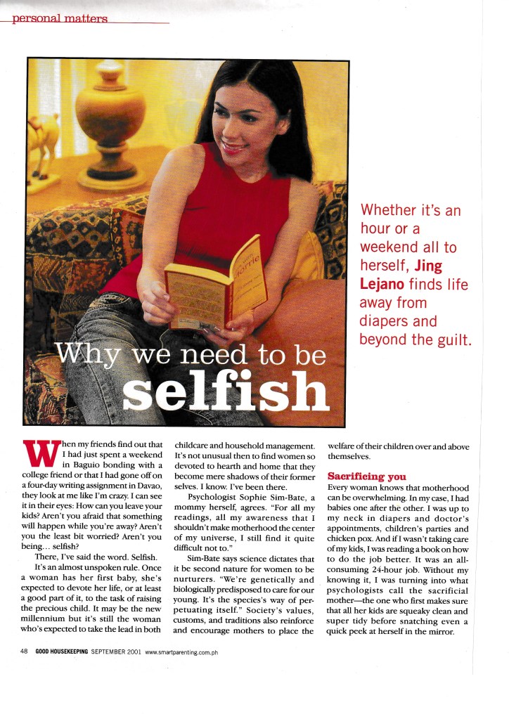 At the time, the idea of mothers taking personal time or me time had still to catch on. I always say that my mother was ahead of her time; she was the one who encouraged me to spend time on me. When later on I became editor in chief of Good Housekeeping PH, this was one of my advocacies, encouraging moms to take care of themselves first.